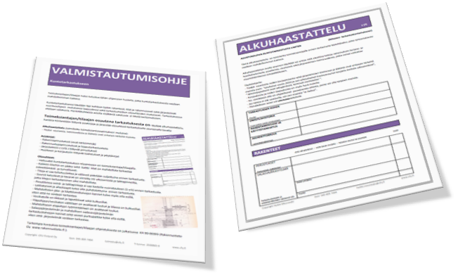 Tarkastus tehdään asuntokaupan kuntotarkastuksen mukaisesti ja laajuudessa (Kuntotarkastus asuntokaupan yhteydessä KH 90-00394, Suoritusohje sekä tilaajan ohje KH 90-00393).